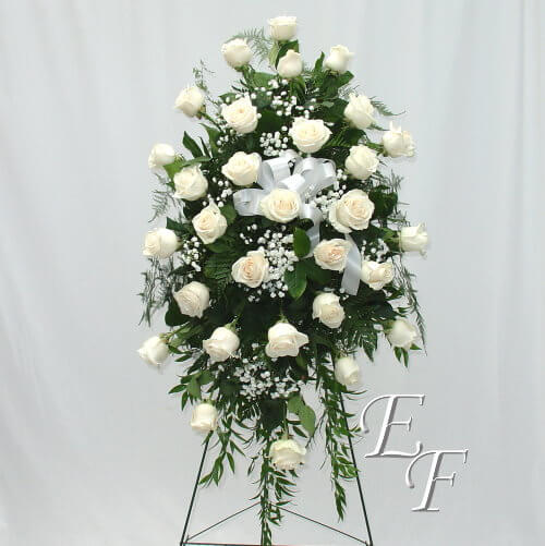 This standing spray is part of our Rose Tribute Collection. Two dozen red roses are arranged against a bed of soft greens and accented with touches of baby’s breath. The spray pictured is approximately 44″ in length and is 22″ in width. The design shown features red roses, but you may choose to have the spray made with white roses, pink roses, or a combination of roses at no additional charge. You may also add script to your design for no additional charge. We have created several upgrade options that would make the spray larger and more impressive.