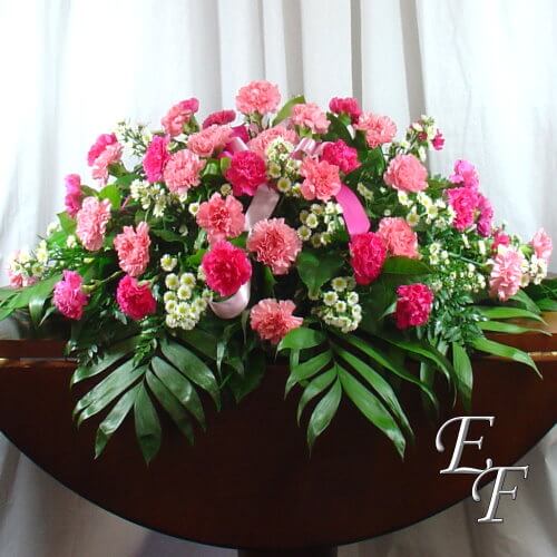 Carnations come in many different colors. The spray pictured is a mix of light pink and hot pink carnations accented with September Flower. You may choose the spray as pictured, or the spray may be made in solid white, pink, or red carnations. You may also select a mix of carnations in combinations of pink, white, and red. The design has a total of 50 carnations, and is designed for an open casket. There are several options to make the spray larger, including one to make the design into a full spray appropriate for a closed casket. Script is available at no additional charge.