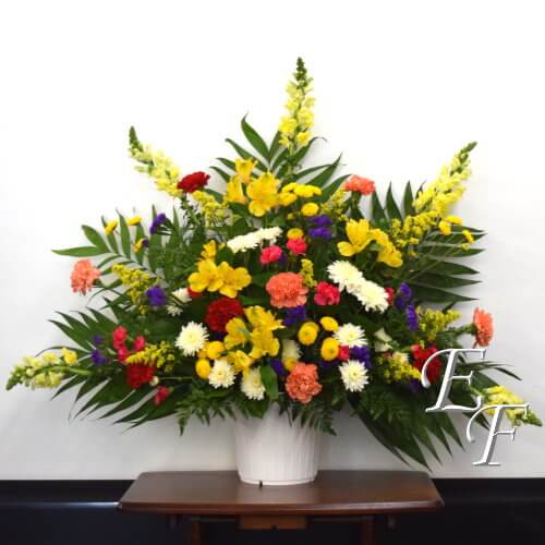 Our Vibrant Memories Mache is part of Our Vibrant Sympathy Collection which features bright, bold colors. This floral mache is one of our larger floral tributes made of yellow snap dragons, orange carnations, yellow alstromeria and assorted mums. Hot pink miniature carnations and purple status make the design stand out. You have several options to upgrade this design to make it a fuller and more showy. As always, script is available at no charge.
