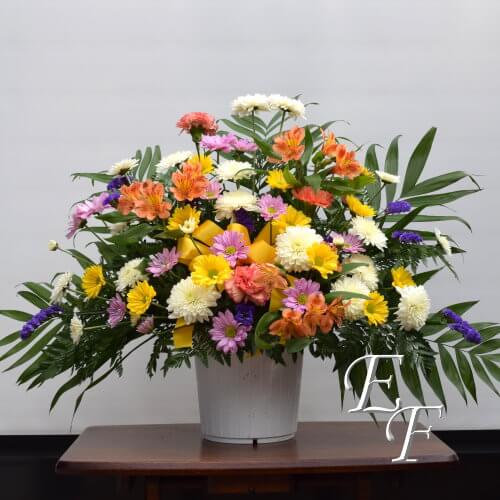 Our Vibrant Sympathy Collection features bright, bold colors. This floral mache is made with orange alstromeria, yellow & lavender daisies, and long lasting carnations. You have several options to upgrade this design to make it a fuller and more showy. As always, script is available at no charge.
